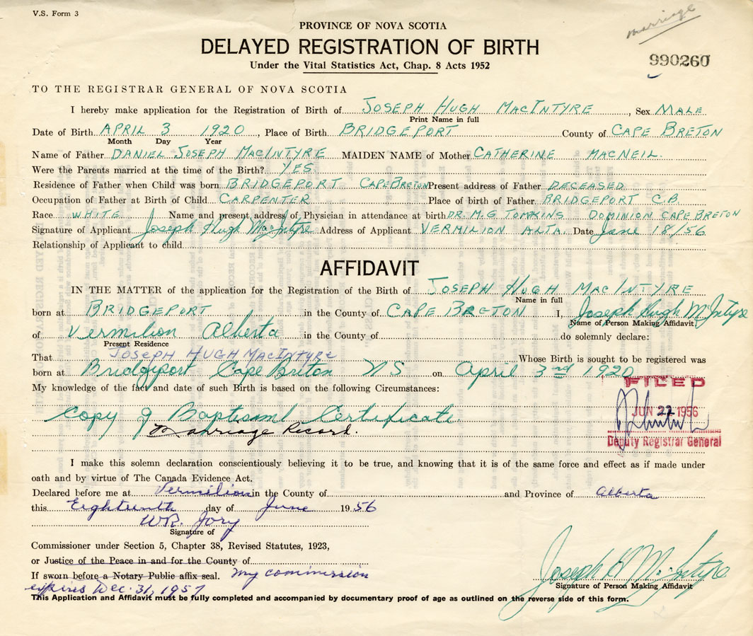 Signature of Applicant Joseph Hugh MacIntyre Address of Applicant Vermilion, Alberta Date June 18, 1956