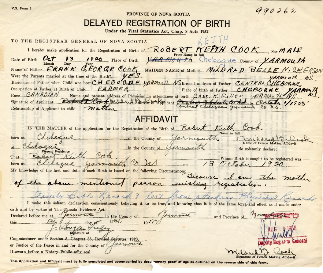 Date of Birth October 13, 1920 Place of Birth ChebogueCounty of Yarmouth