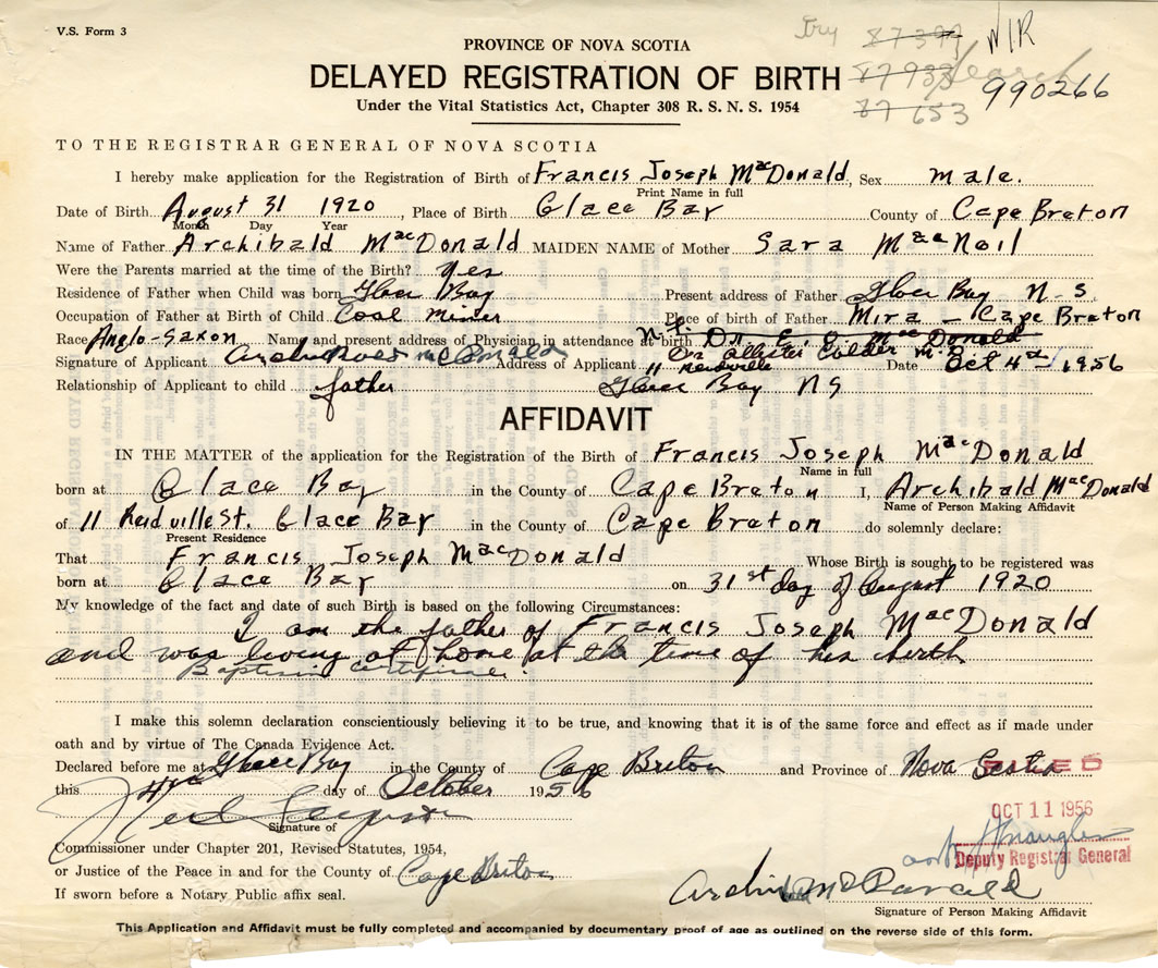 Date of Birth August 31, 1920 Place of Birth Glace BayCounty of Cape Breton