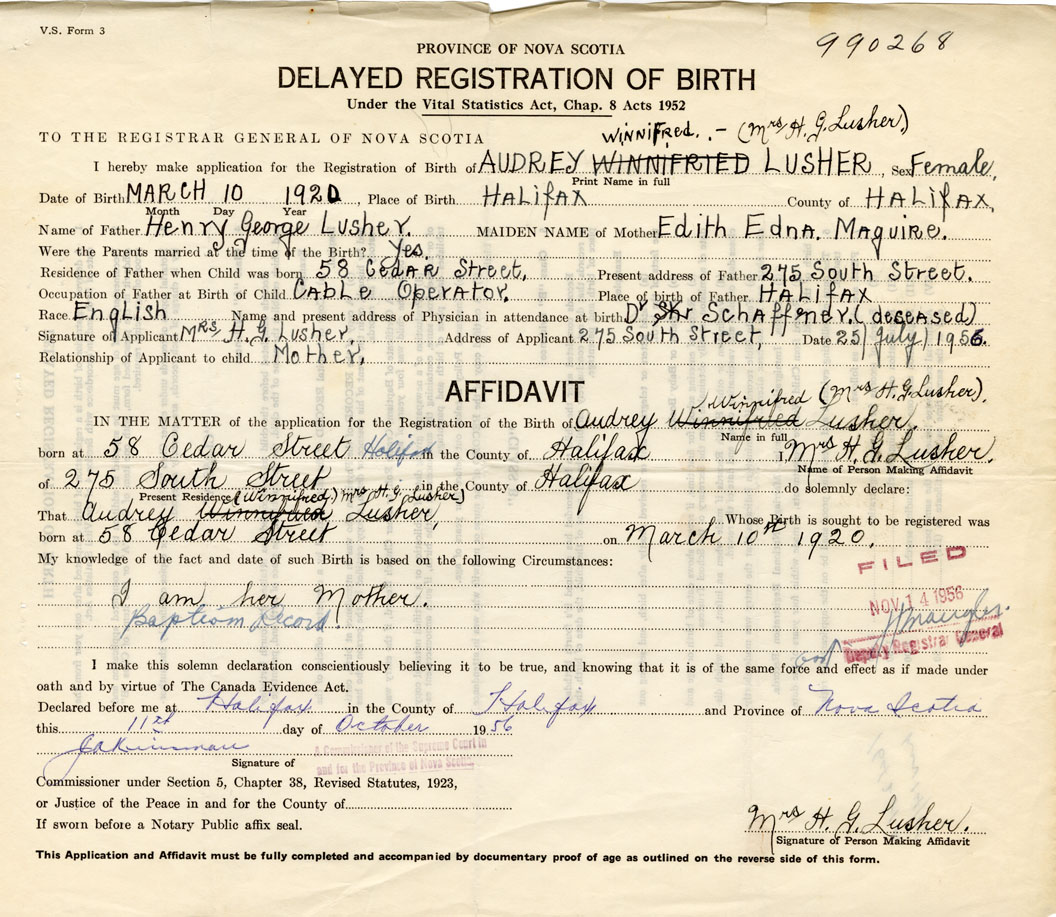 I hereby make application for the Registration of Birth of Audrey WinnifredLusher Sex