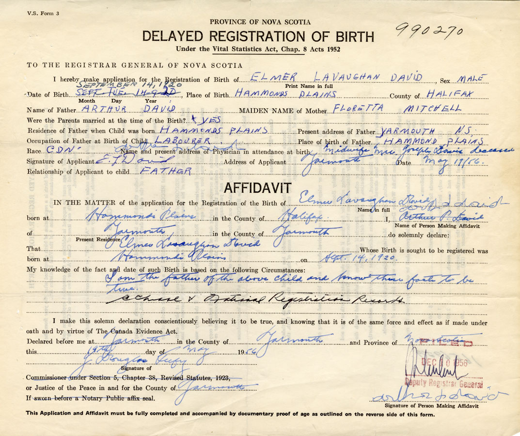 I hereby make application for the Registration of Birth of Elmer Lavaughan David Sex