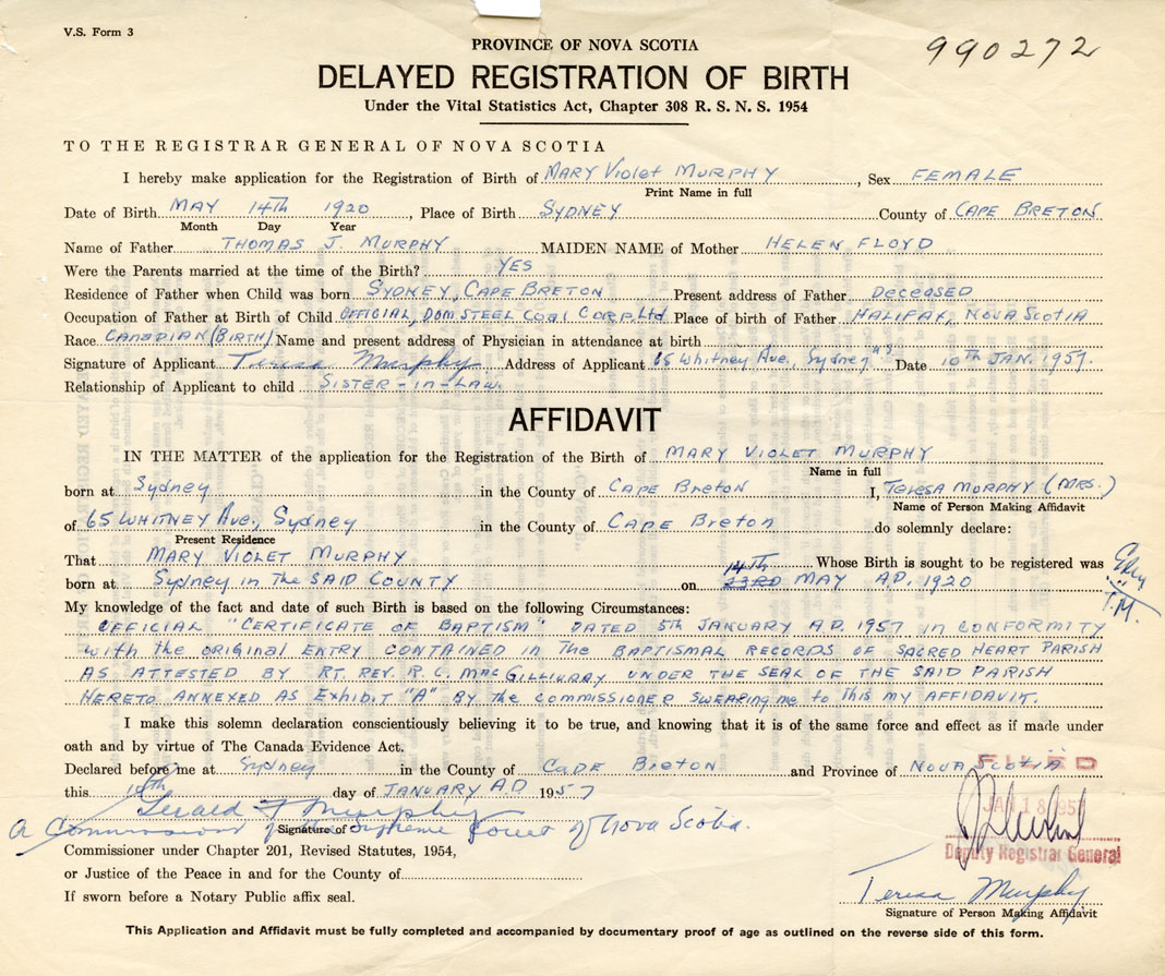 IN THE MATTER of the application for the Registration of the Birth of Mary Violet Murphy
