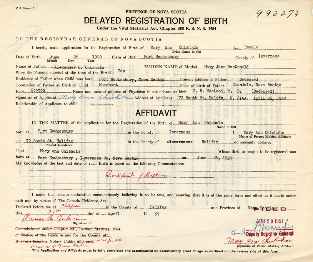 Signature of Applicant Mary Ann Chisholm Address of Applicant 72 South Street, Halifax Date April 26, 1957