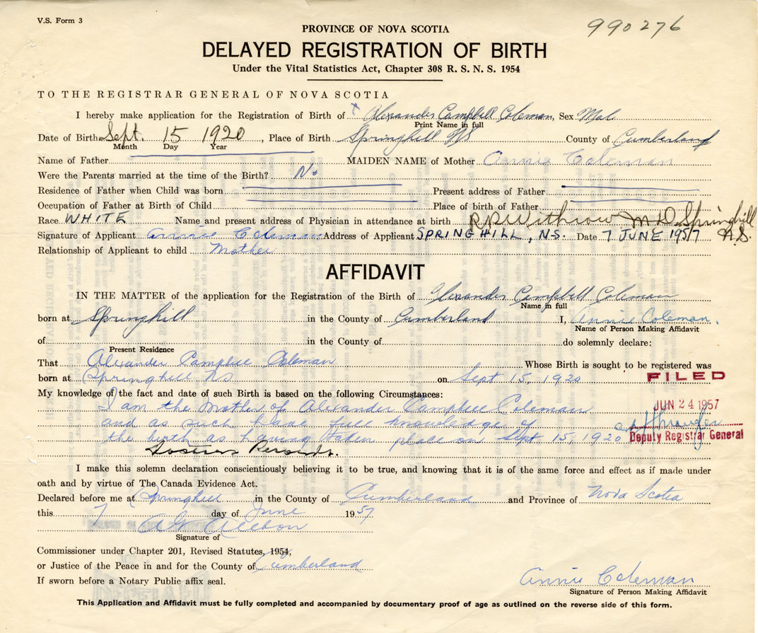 I am the mother of Alexander Campbell Coleman and as such have full knowledge of the birth as having taken place on Sept. 15, 1920