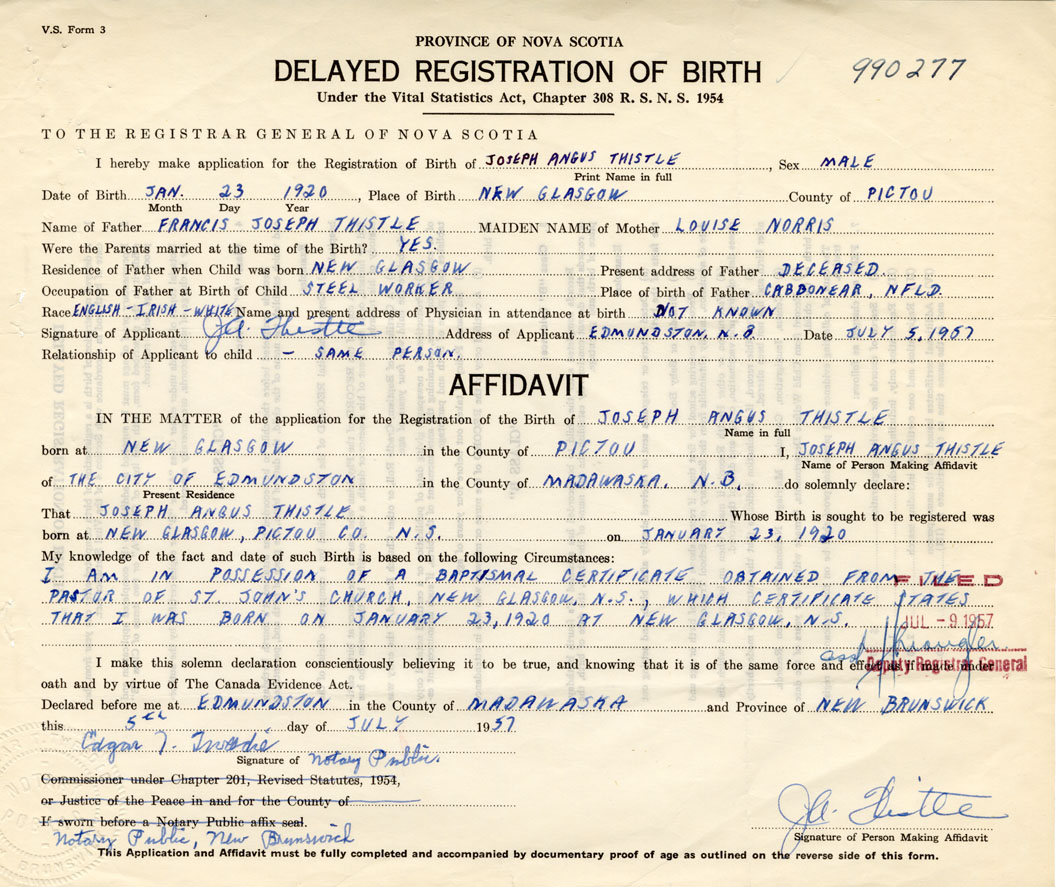 I am in possession of a baptismal certificate obtained from the pastor of St. John's Church, New Glasgow, which certificate states that I was born on January 23, 1920 at New Glasgow