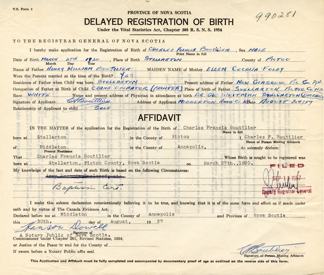 I hereby make application for the Registration of Birth of Charles FrancisBoutilier Sex