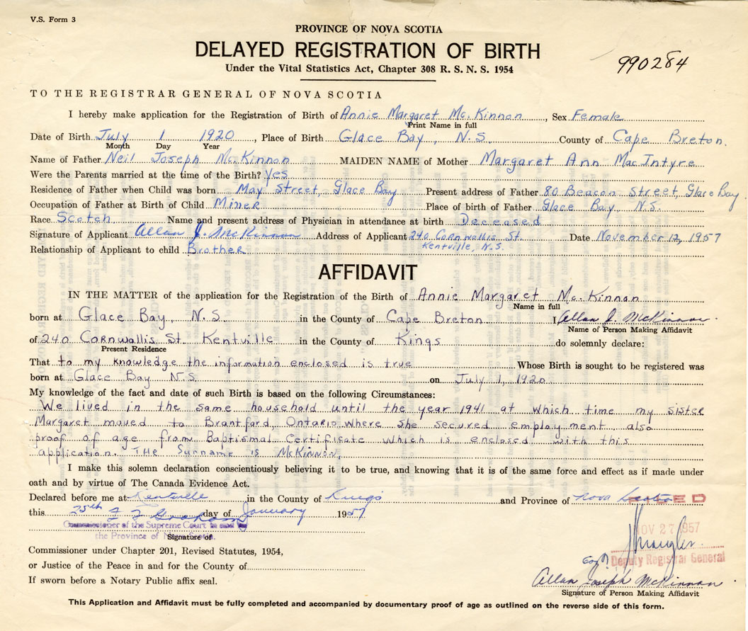 We lived in the same household until the year 1941 at which time my sister Margaret moved to Brantford, Ontario where she secured employment also proof of age from Baptismal Certificate which is enclosed with this application. The surname is McKinnon.
