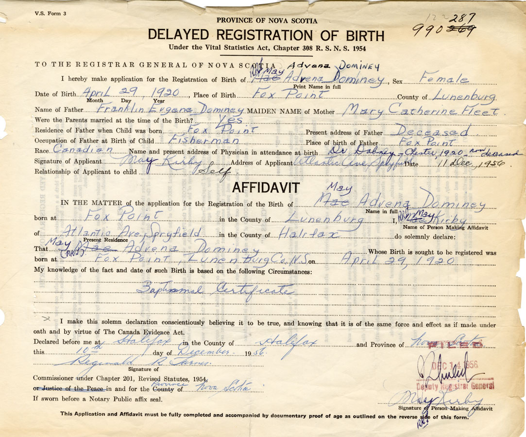 Date of Birth April 29, 1920 Place of Birth Fox PointCounty of Lunenburg