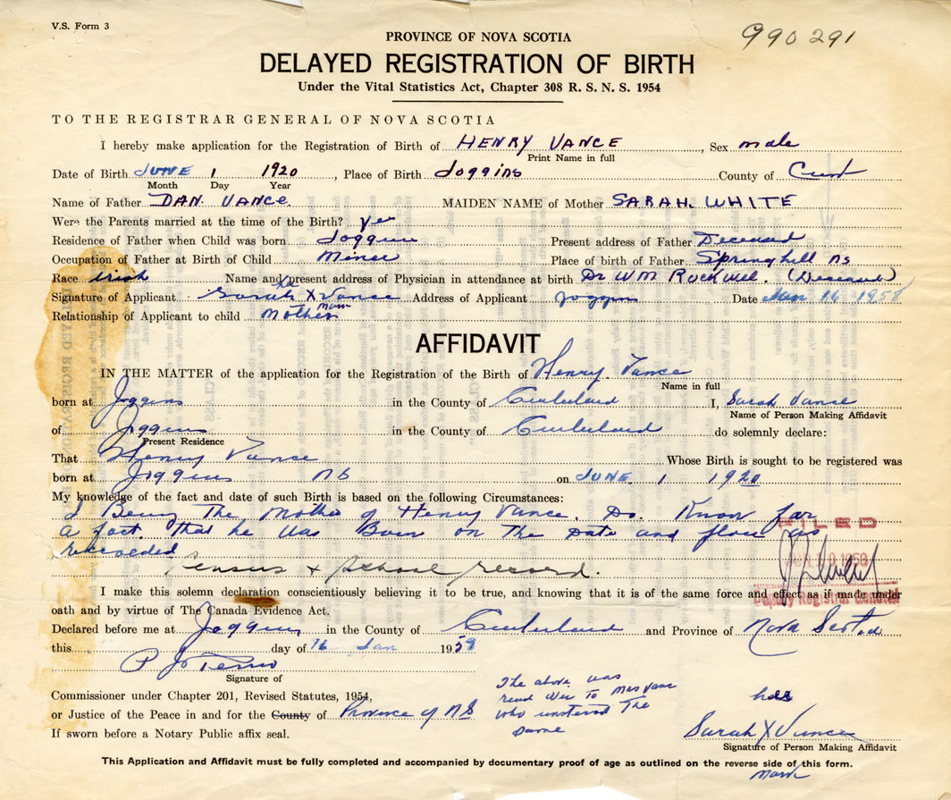 I hereby make application for the Registration of Birth of HenryVance Sex Male