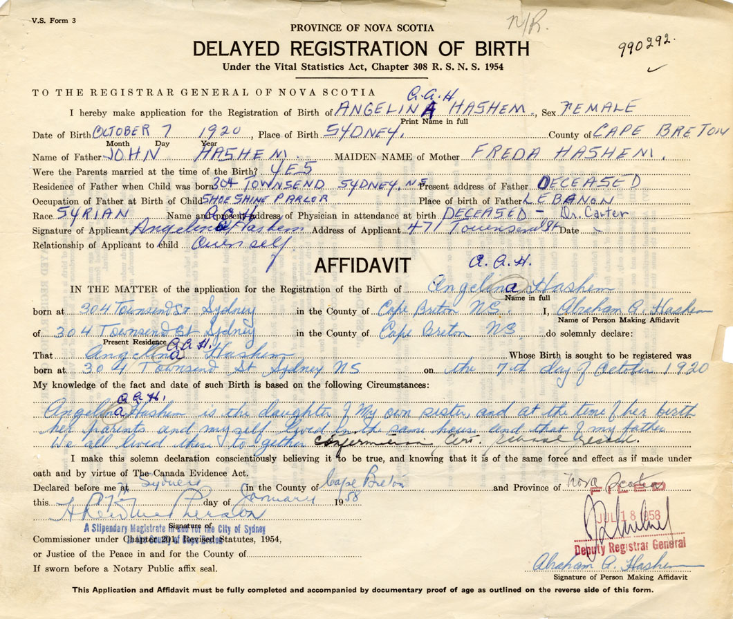 Signature of Applicant Angelina Hashem Address of Applicant 471 Townsend Street, Sydney, Cape Breton Co. Date 17 January 1958