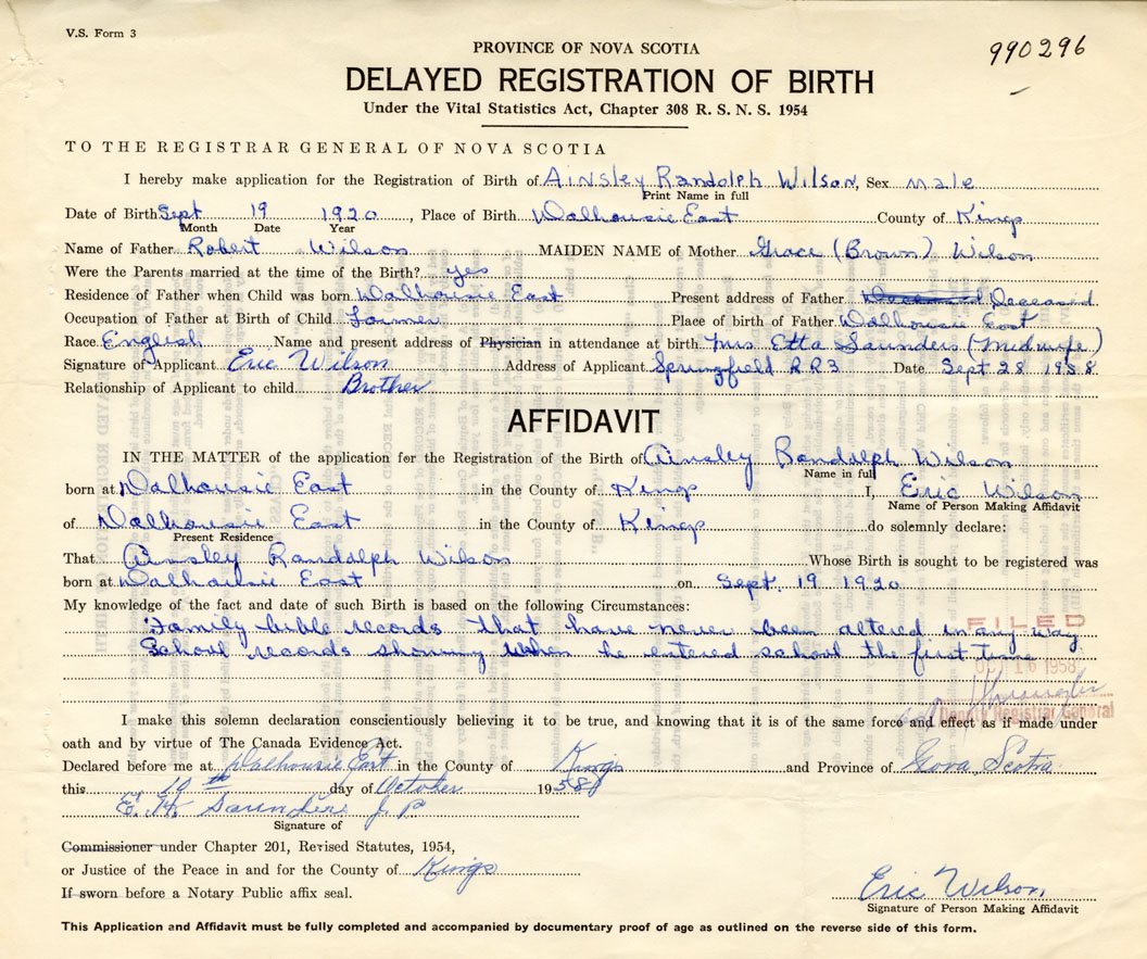 I hereby make application for the Registration of Birth of Ainsley RandolphWilson Sex Male