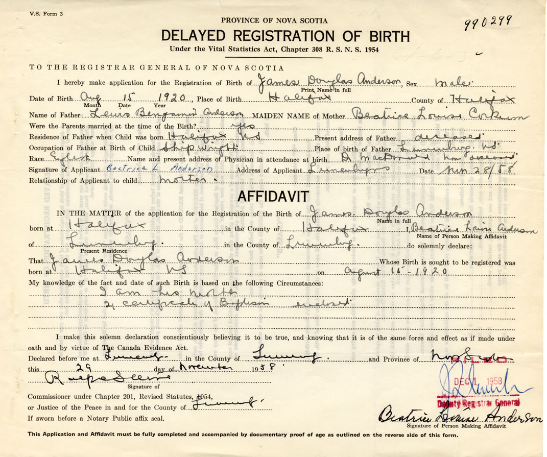 I hereby make application for the Registration of Birth of James DouglasAnderson Sex Male