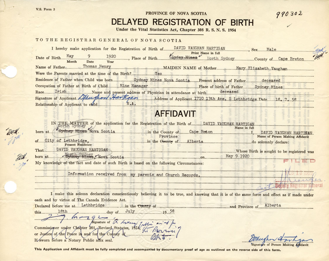 Signature of Applicant D. Vaughan Hartigan Address of Applicant 1710 13th Avenue, South Lethbridge, Alberta Date 18 July 1958