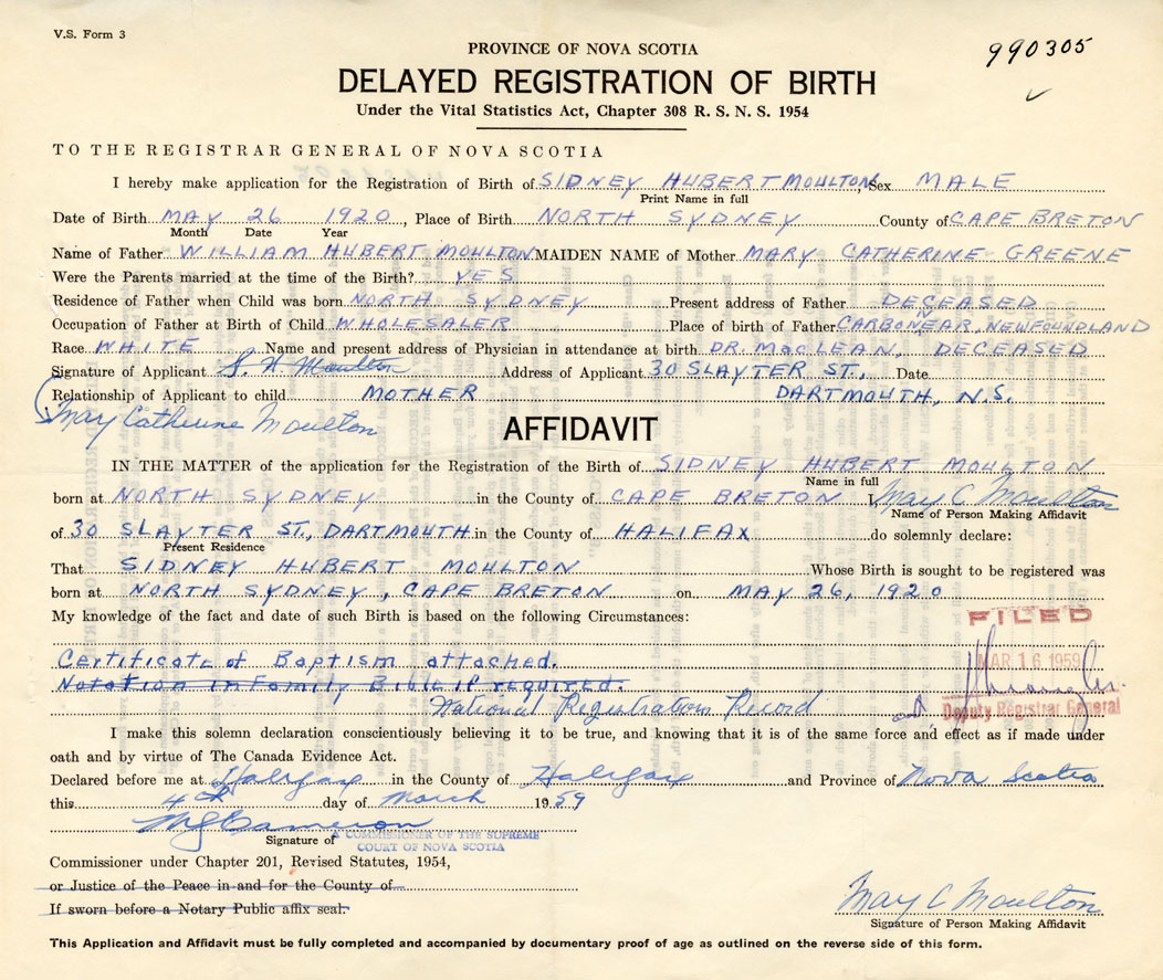 Date of Birth March 26, 1920 Place of Birth North SydneyCounty of Cape Breton