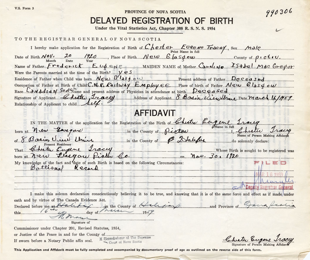 Date of Birth November 20, 1920 Place of Birth New GlasgowCounty of Pictou