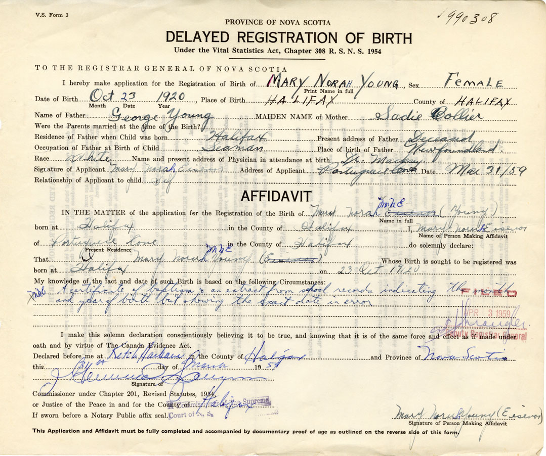 Signature of Applicant Mary Norah Eisenor Address of Applicant Portuguese Cove, Halifax Co. Date 31 March 1959