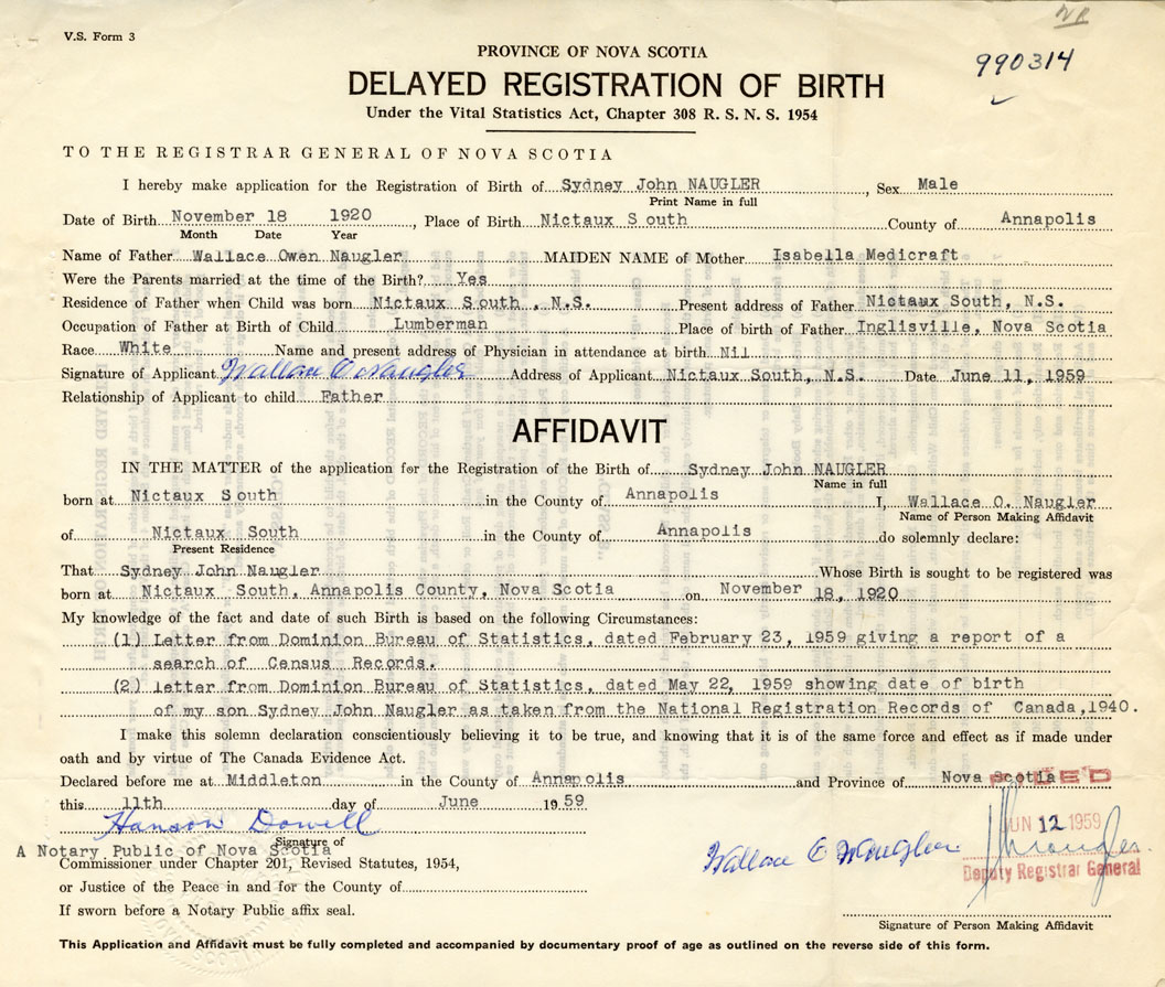 1. Letter from Dominion Bureau of Statistics, dated February 23, 1959 giving a report of a search or Census records. 2. Letter from Dominion Bureau of Statistics, dated May 22, 1959 showing date of birth of my son Sydney John Naugler as taken from the National Registration Records of Canada, 1940.