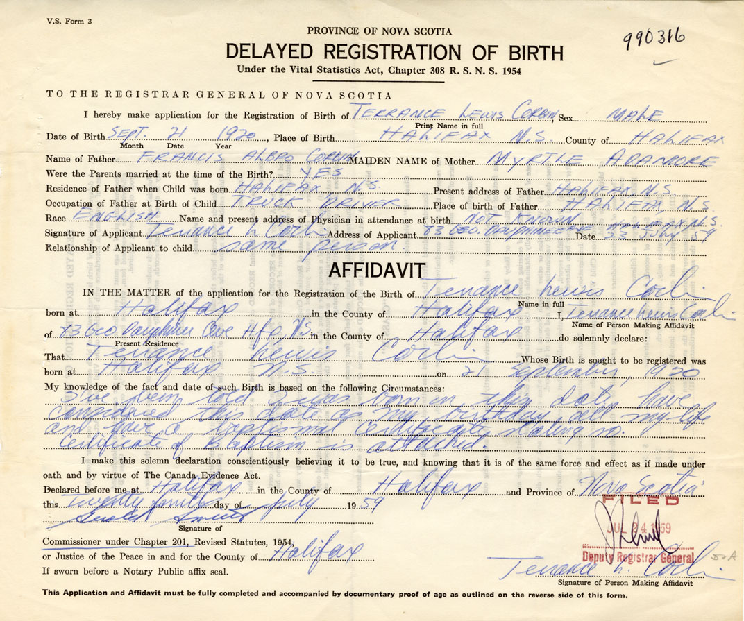 Signature of Applicant Terrance L. Corbin Address of Applicant 83 George Dauphinee Avenue, Halifax Date 23 July 1959