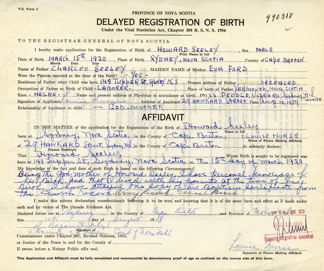 Being the Godmother of Howard Seeley, I have personal knowledge of his birth and that I lived with his parents at the time of his birth. I have attached one copy of his Baptism certificate from the Church record. Army record, School records.