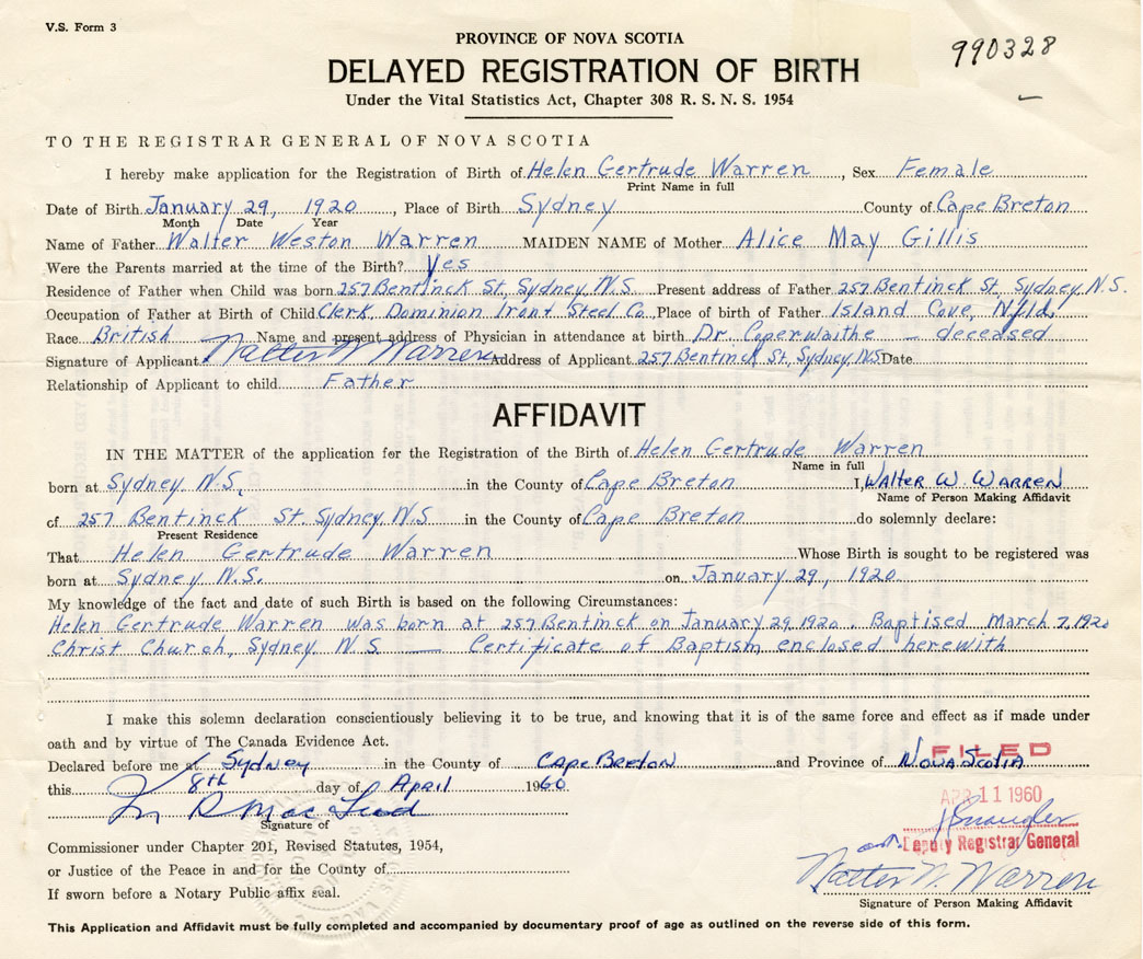 Helen Gertrude Warren was born at 257 Bentinck on January 29, 1920. Baptized March 7, 1920, Christ Church, Sydney. Certificate of Baptism enclosed herewith.