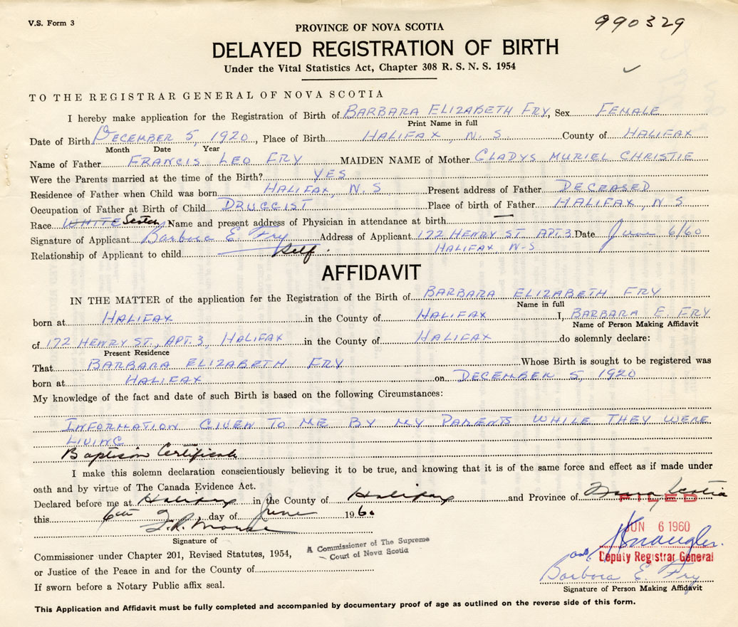 Signature of Applicant Barbara E. Fry Address of Applicant 172 Henry Street, Apt 3, Halifax Date 6 June 1960