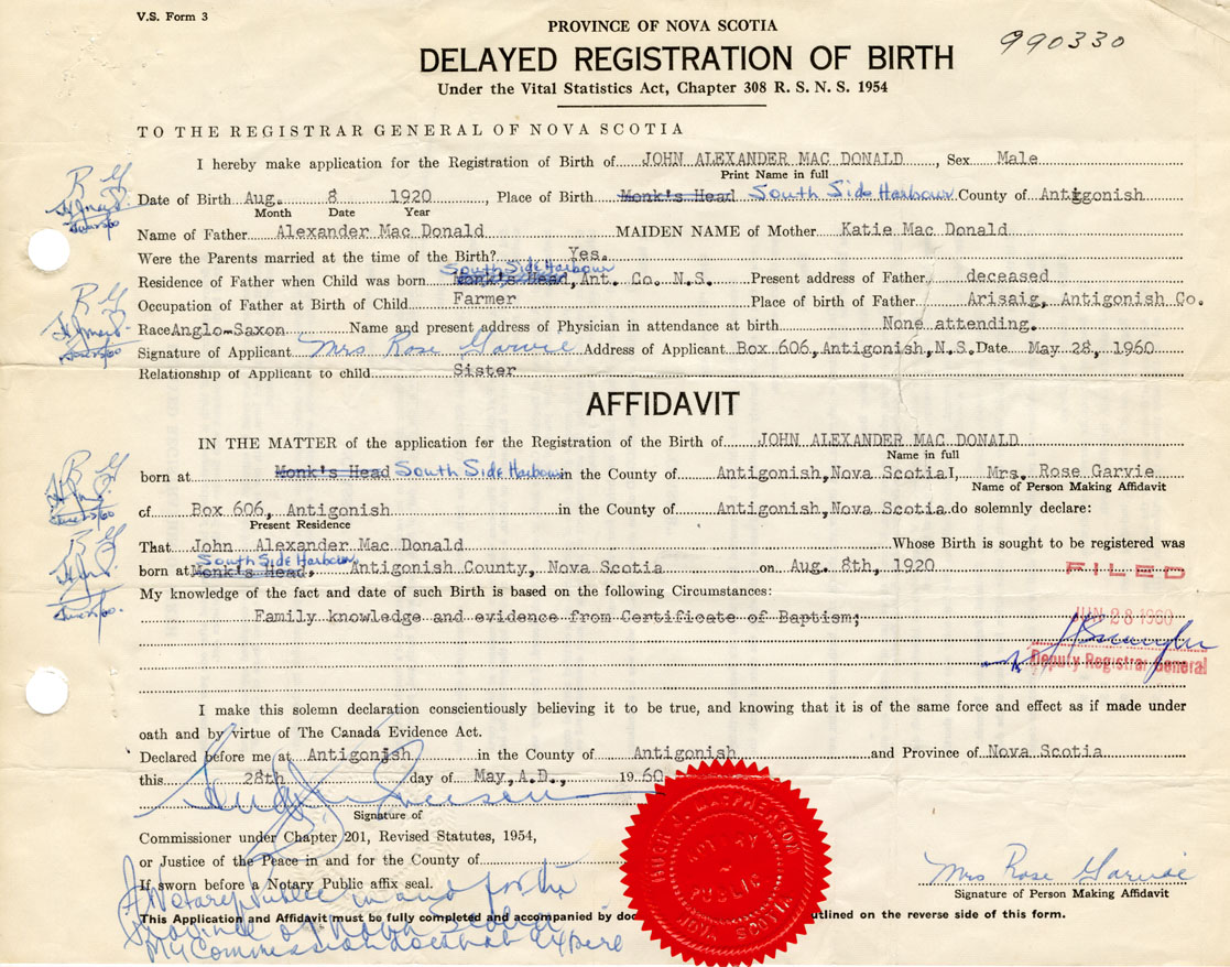 I hereby make application for the Registration of Birth of John AlexanderMacDonald Sex Male