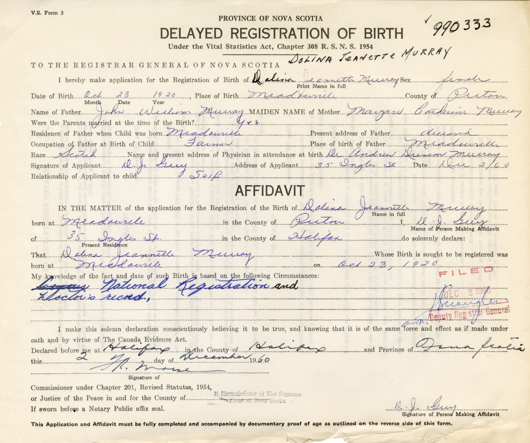 Date of Birth October 23, 1920 Place of Birth MeadowvilleCounty of Pictou