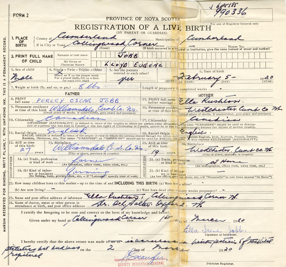 I hereby make application for the Registration of Birth of Lloyd EugeneJobb Sex Male
