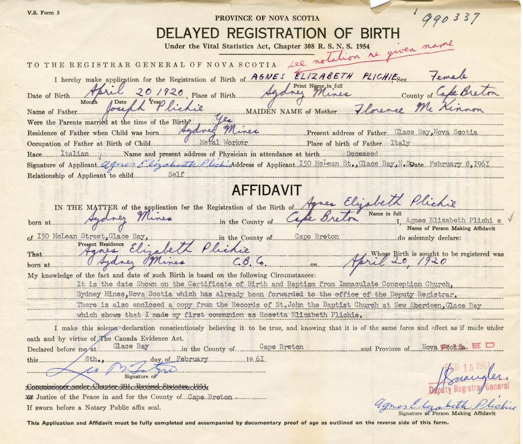 It is the date shown on the certificate of birth and Baptism from Immaculate Conception Church, Sydney Mines which has already been forwarded to the Office of the Deputy Registrar. There is also enclosed a copy from the records of St. John the Baptist Church at New Aberdeen, Glace Bay which shows that I made my first communion as Rosetta Elizabeth Plichie