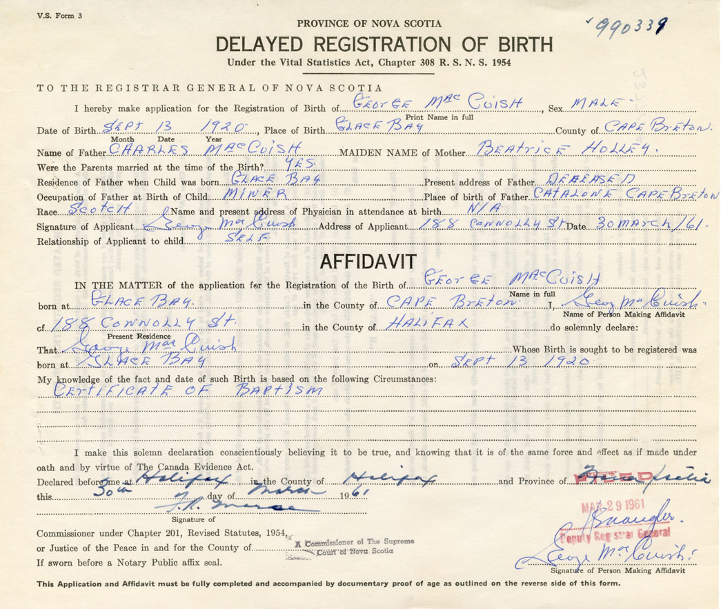 Signature of Applicant George MacCuish Address of Applicant 188 Connolly Street, Halifax Date 30 March 1961