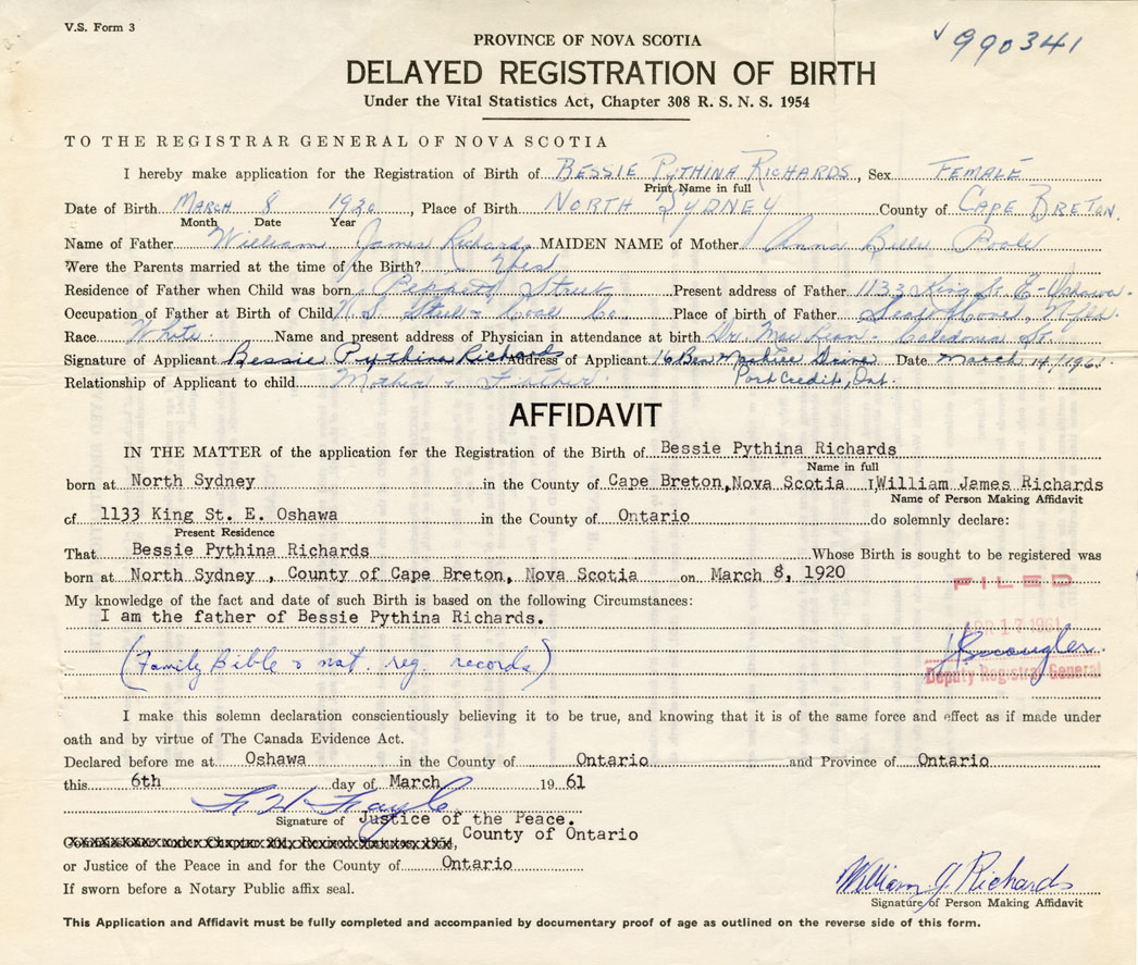 Signature of Applicant Bessie Pythina Richards Address of Applicant 16 Ben Machiee Drive, Port Credit, Ontario Date 14 March 1961