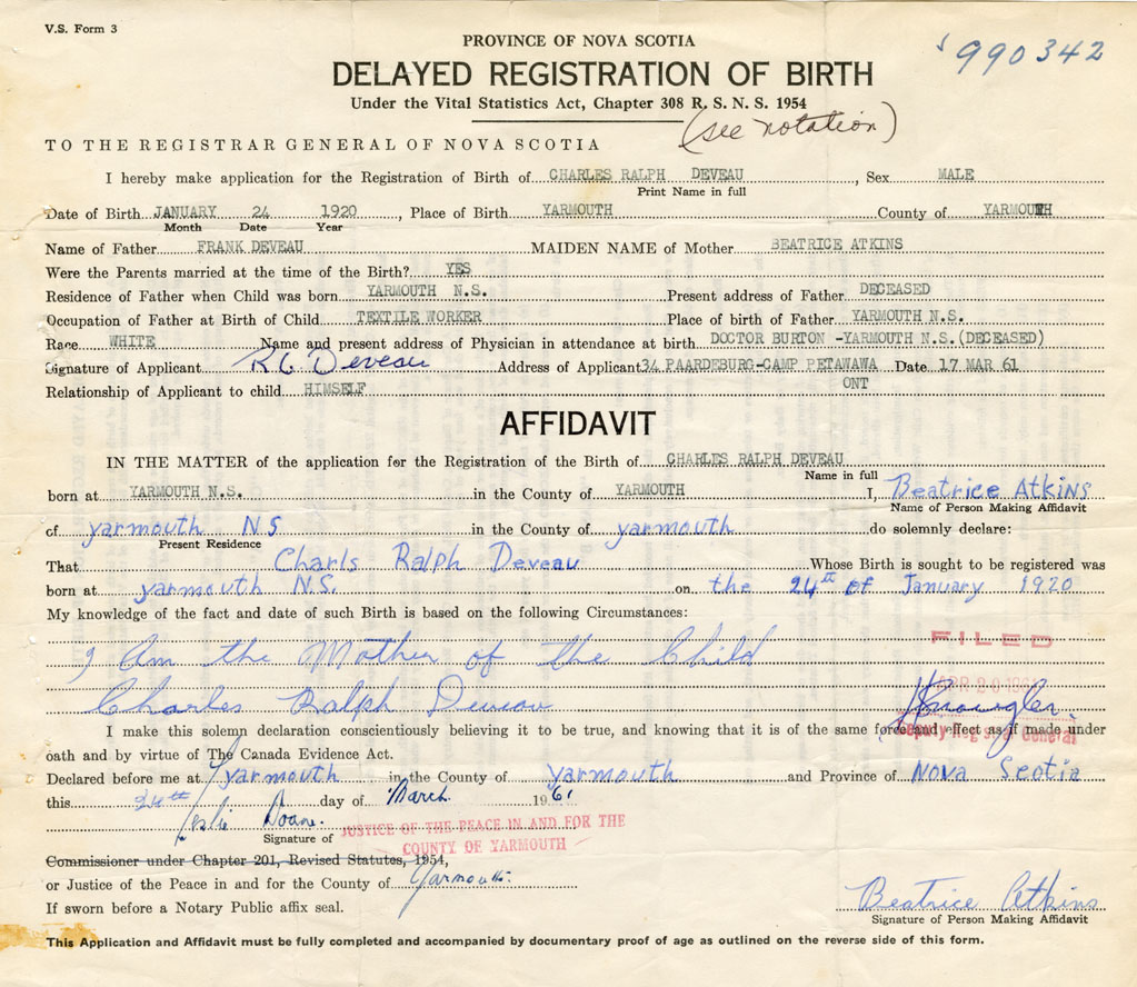 I hereby make application for the Registration of Birth of Charles RalphDeveau Sex Male