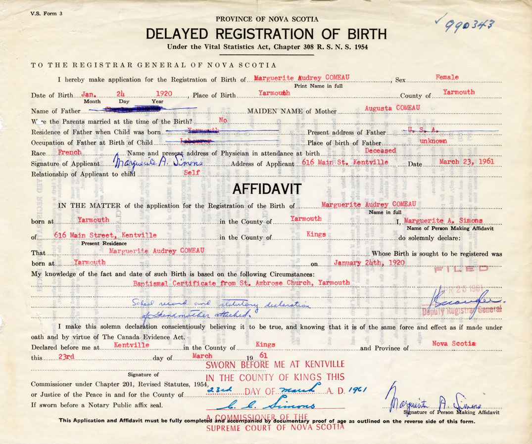 I hereby make application for the Registration of Birth of Marguerite AudreyComeau Sex Female