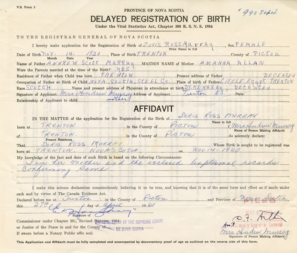 IN THE MATTER of the application for the Registration of the Birth of Doris RossMurray