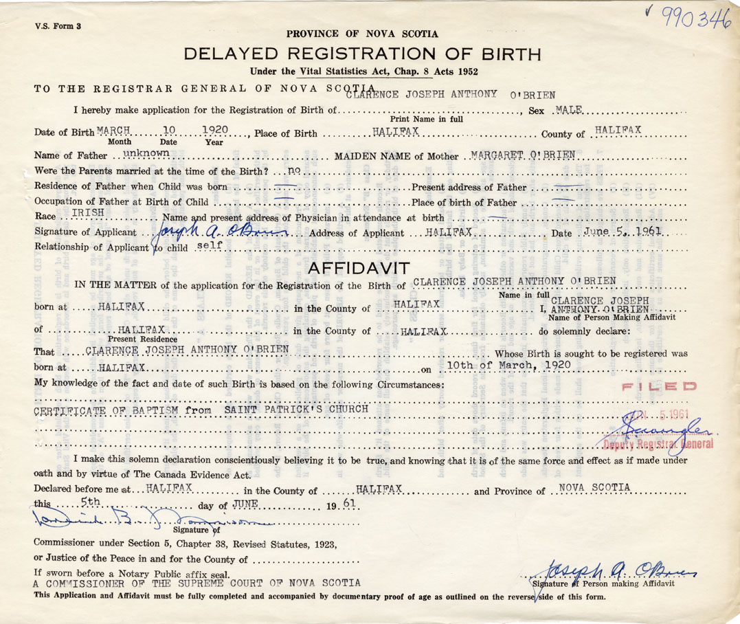 I hereby make application for the Registration of Birth of Clarence Joseph AnthonyO'Brien Sex