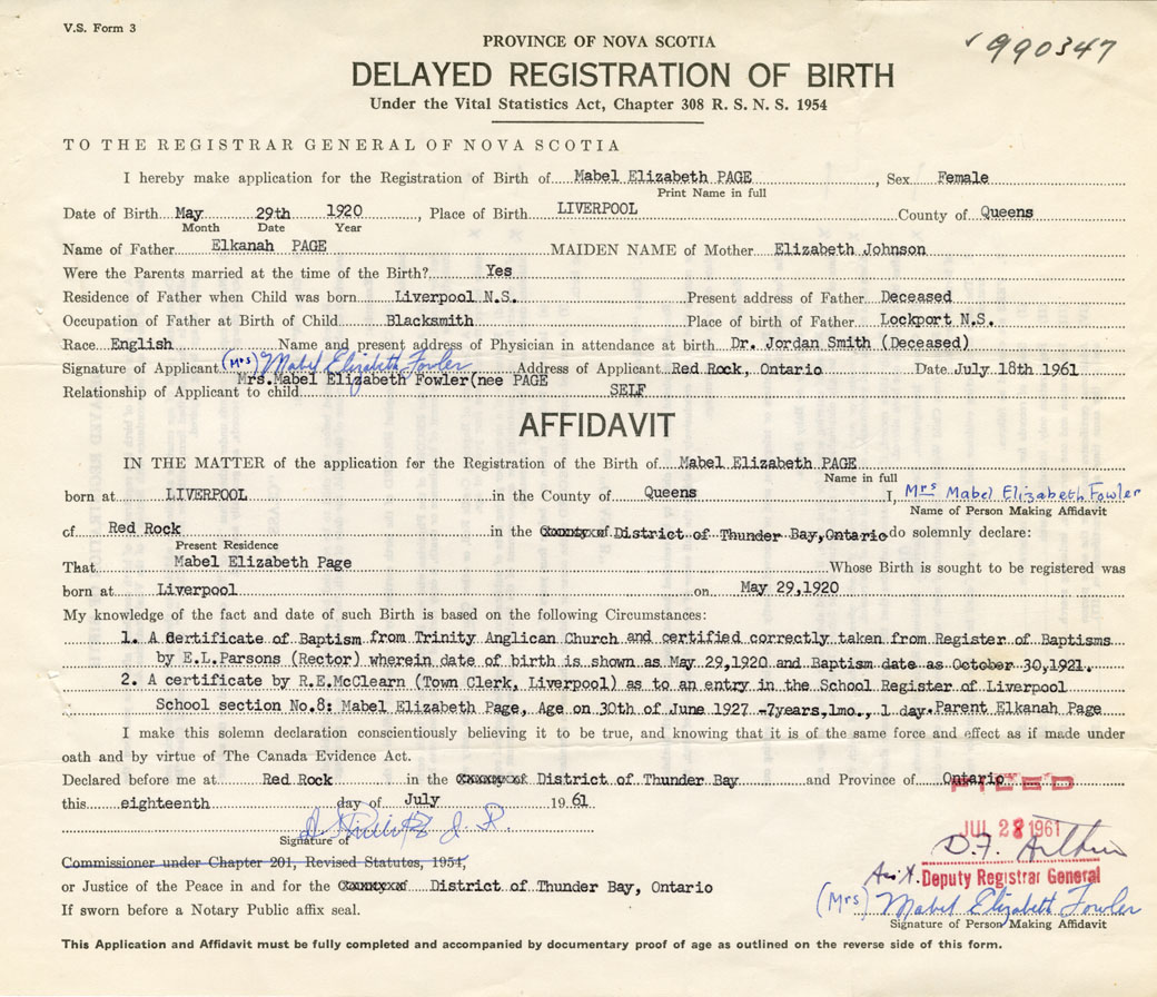 Signature of Applicant Mrs. Mabel Elizabeth Fowler Address of Applicant Red Rock, Ontario Date 18 July 1961
