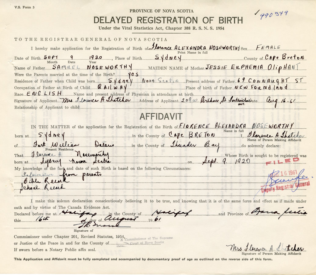 I hereby make application for the Registration of Birth of Florence AlexandraNoseworthy Sex Female