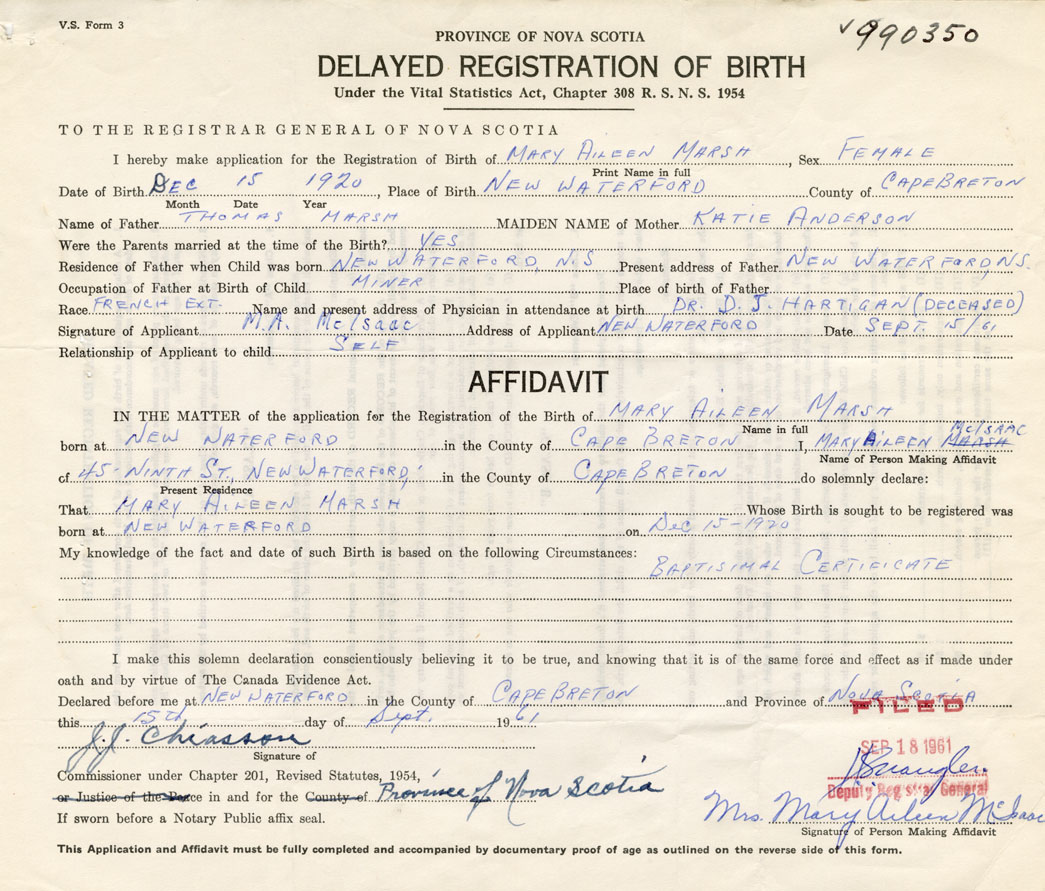 Date of Birth December 15, 1920 Place of Birth New WaterfordCounty of Cape Breton