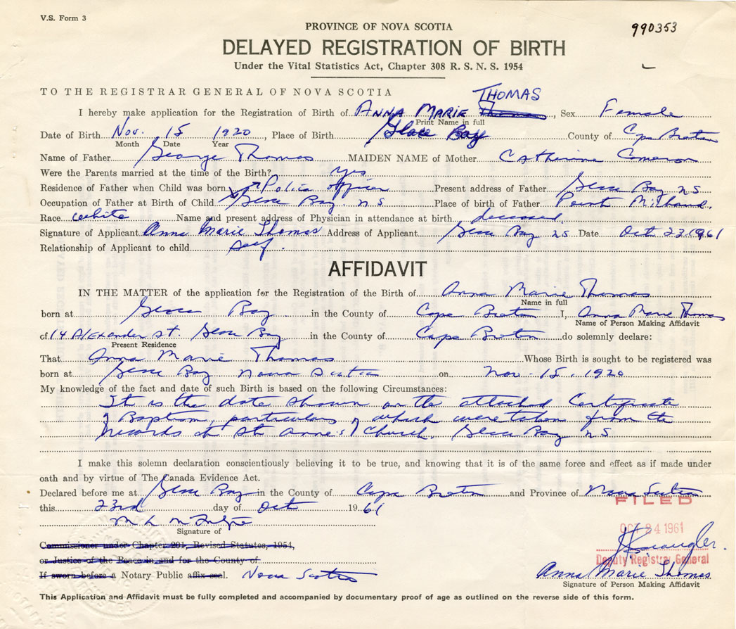Signature of Applicant Anne marie Thomas Address of Applicant Glace Bay, Cape Breton Co. Date 23 October 1961