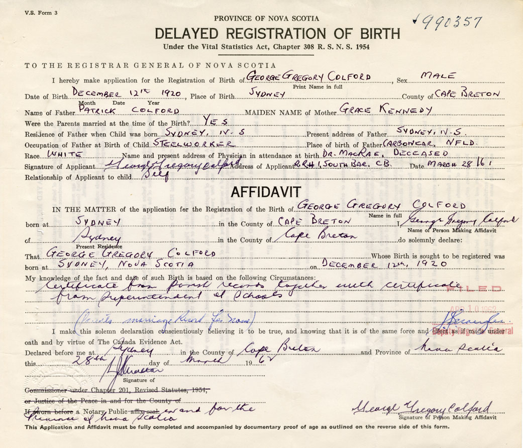 Signature of Applicant George Gregory Colford Address of Applicant RR #1, South Bar, Cape Breton Co. Date 28 March 1961
