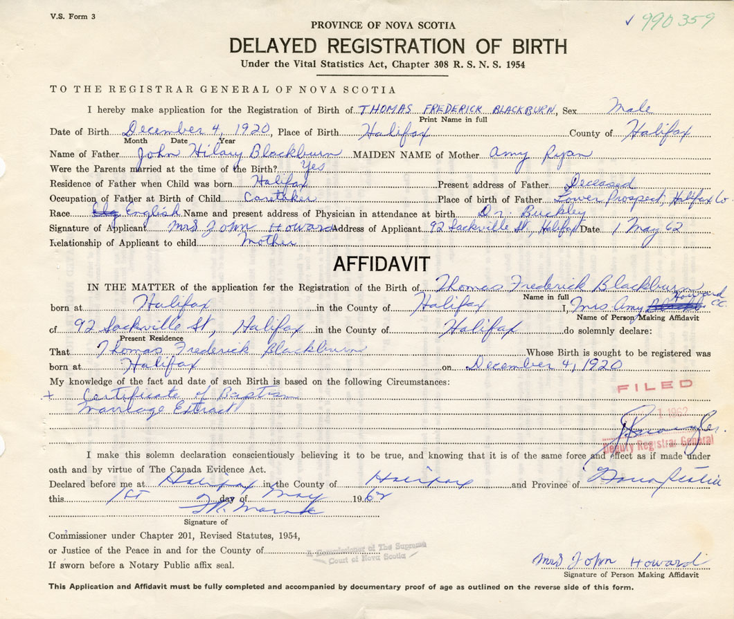 Name of Father John Hilary Blackburn MAIDEN NAME of Mother Amy Ryan