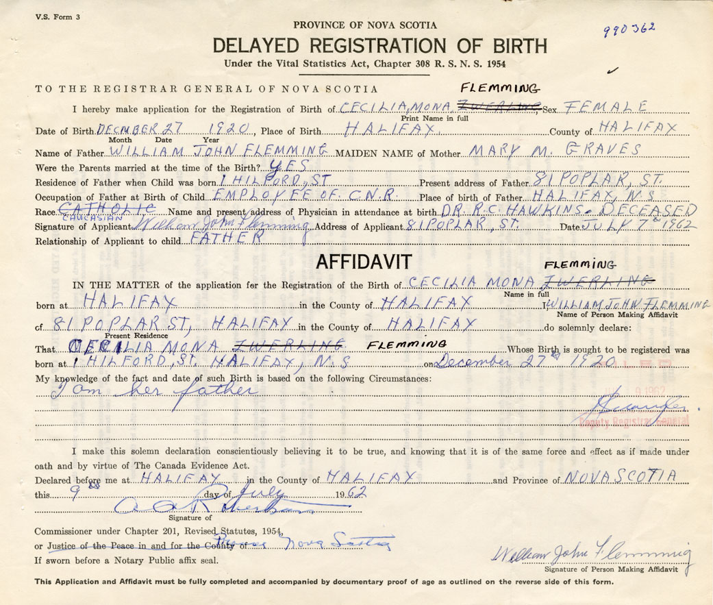 Signature of Applicant William John Flemming Address of Applicant 81 Poplar Street, Halifax Date July 7, 1962