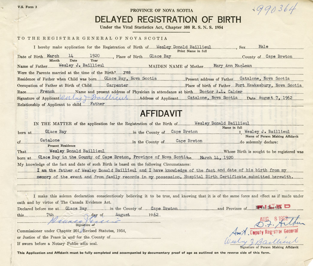 I am the father of Wesley Donald Baillieul and I have knowledge of the fact and date of his birth from my memory of the vent and from family records in my possession. Hospital Birth Certificate submitted herewith.