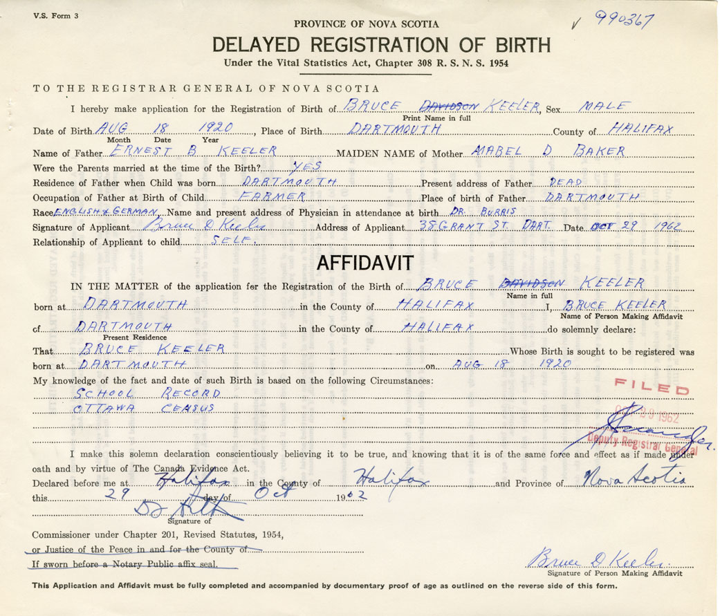 Date of Birth August 18, 1920 Place of Birth DartmouthCounty of Halifax