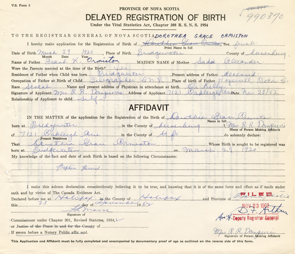 Date of Birth March 29, 1920 Place of Birth BridgewaterCounty of Lunenburg