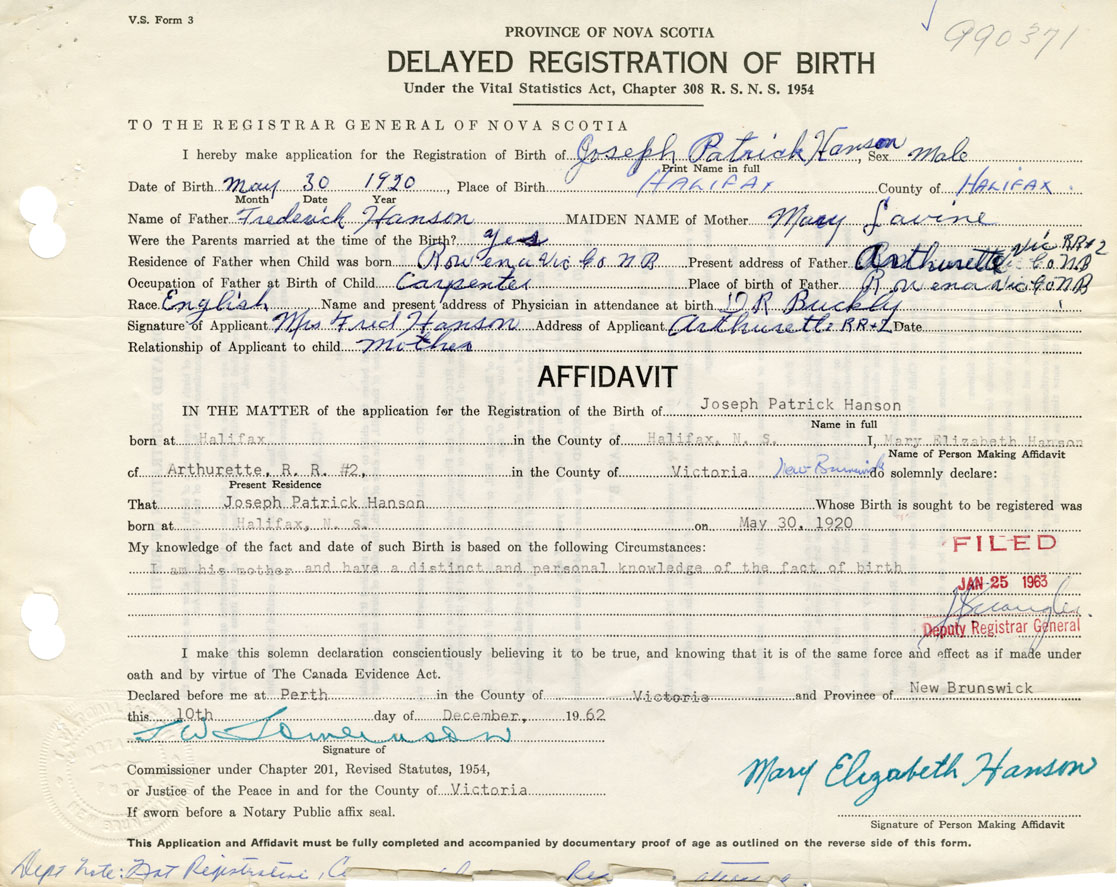 I hereby make application for the Registration of Birth of Joseph PatrickHanson Sex