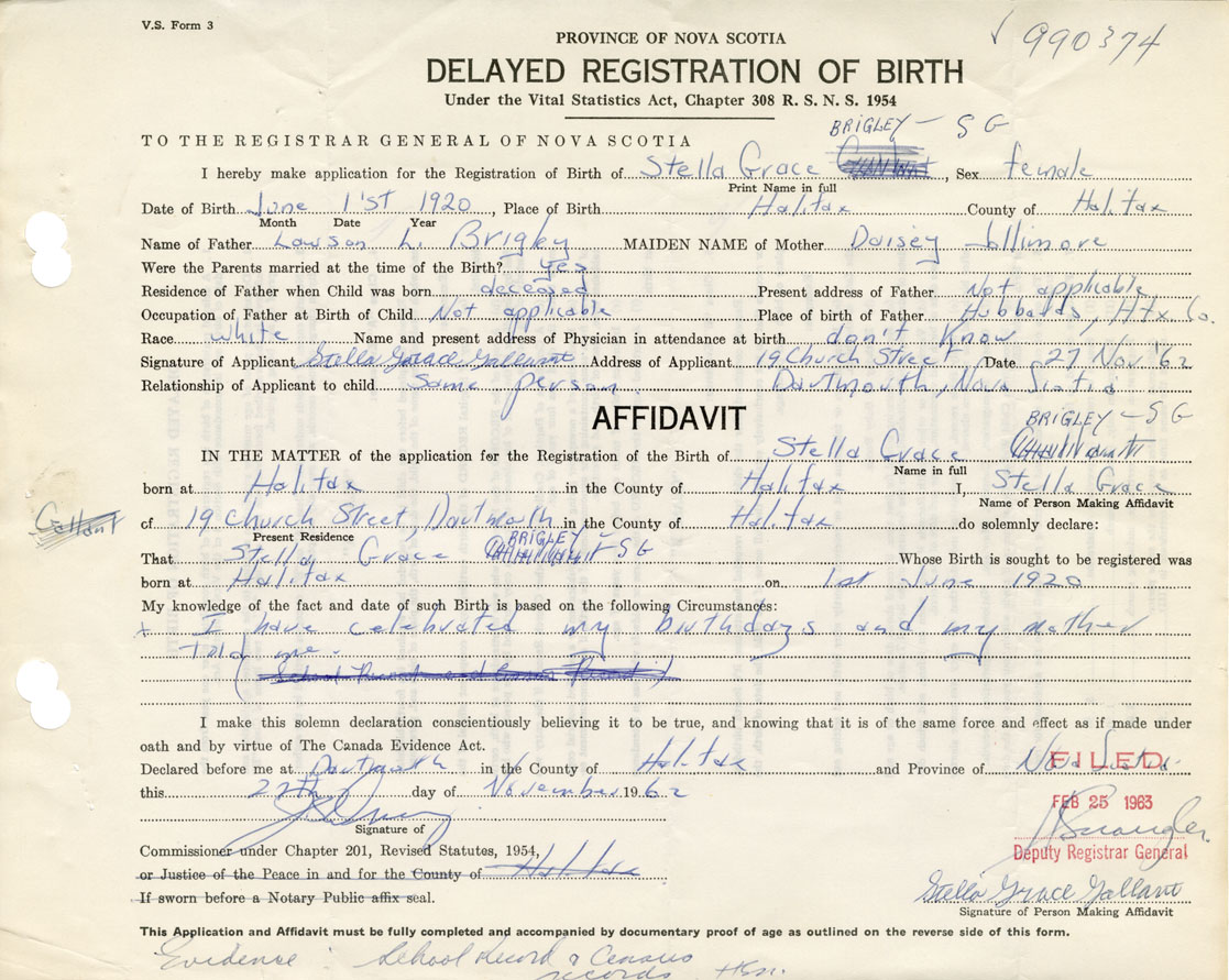 Signature of Applicant Stella Grace Gallant Address of Applicant 19 Church St., Dartmouth Date Nov. 27, 1962