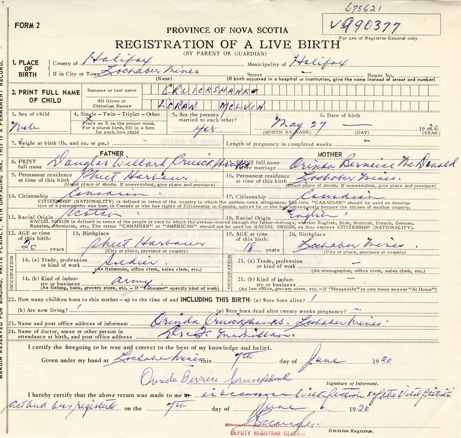 Date of Birth May 27, 1920 Place of Birth Lochaber MinesCounty of Halifax