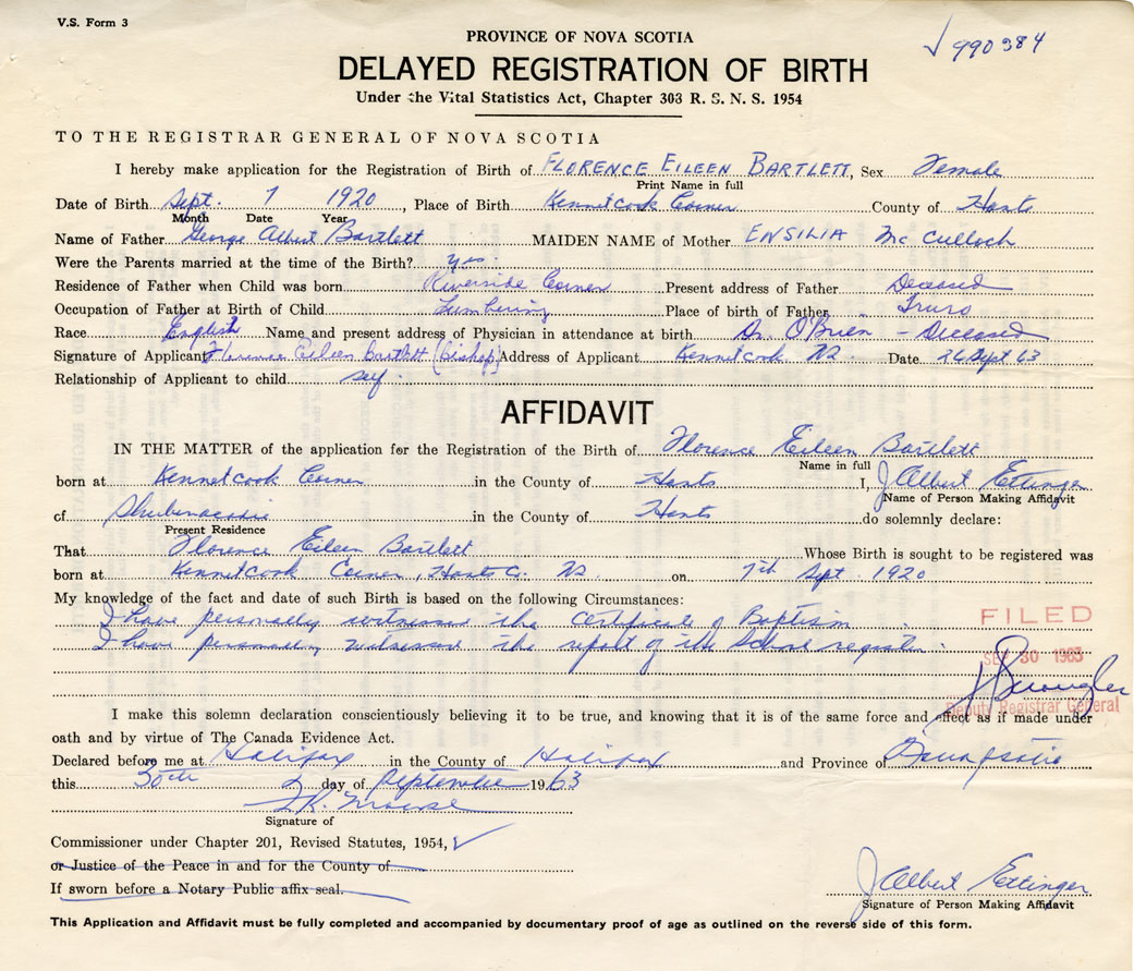 Date of Birth September 7, 1920 Place of Birth Kennetcook CornerCounty of Hants