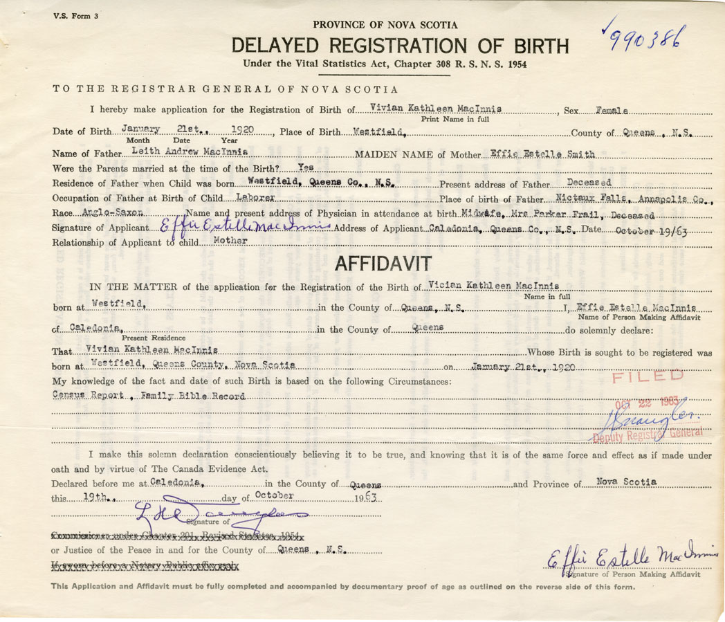 I hereby make application for the Registration of Birth of Vivian KathleenMacInnis Sex Female